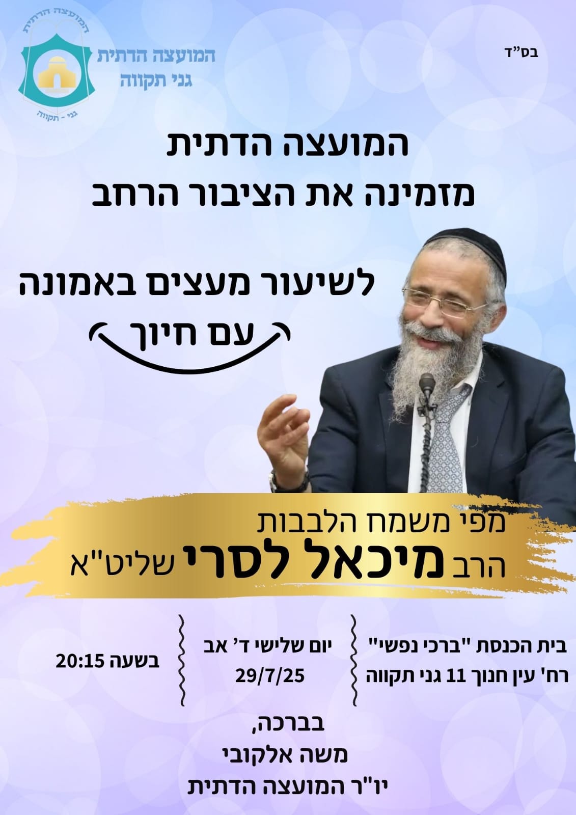 חדשות בכותרות, מהנעשה במועצה, תרבות תורנית הרב מיכאל לסרי שליט"א ד' אב תשפ"ה 29/7/25 אוגוסט 28, 2025 פורסם על ידי משרד מועצה דתית 28 אוג