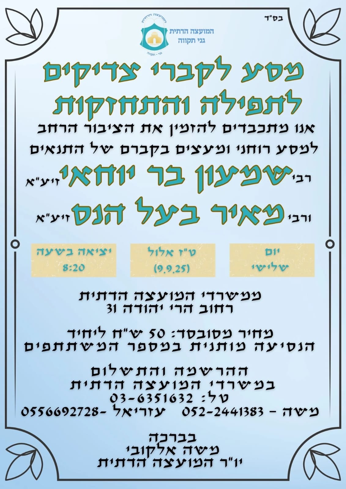 חדשות בכותרות, מהנעשה במועצה, תרבות תורנית מסע לקברי צדיקים ט"ז אלול תשפ"ה (9/9/25) ספטמבר 11, 2025 פורסם על ידי משרד מועצה דתית 11 ספט